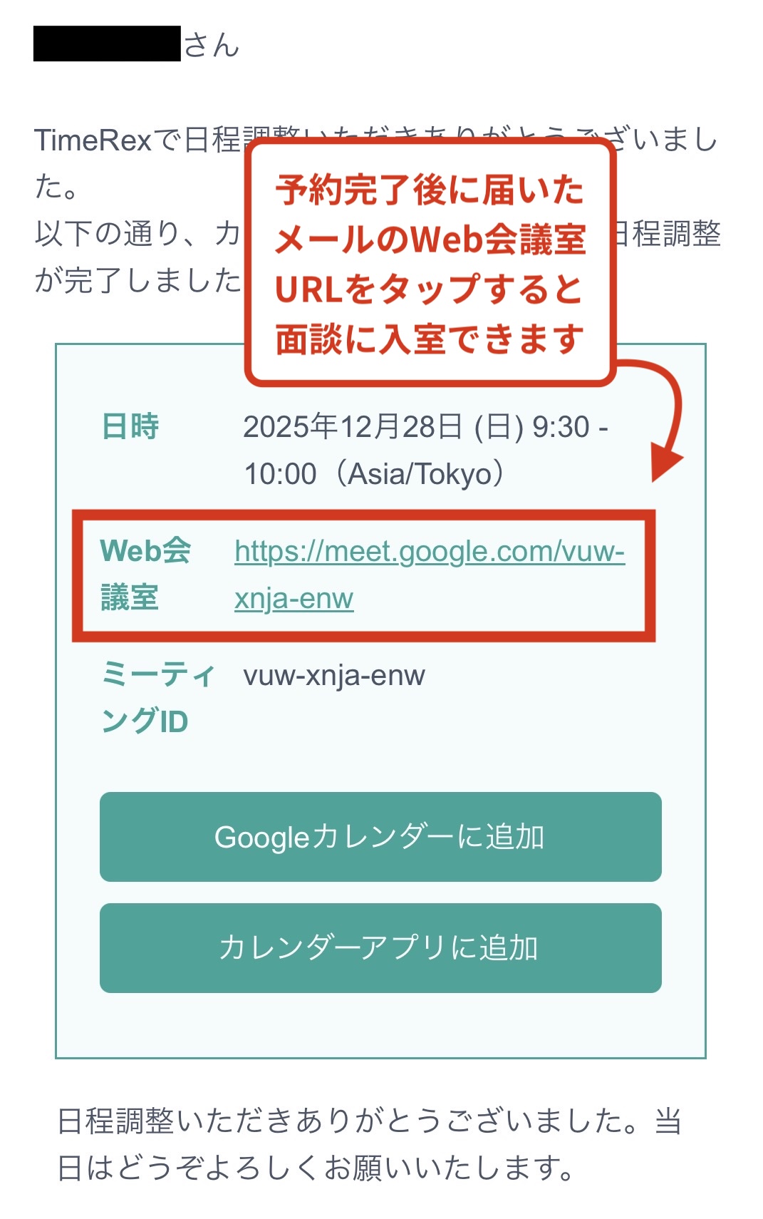 予約が完了すると、入力いただいたメールアドレス宛に【 予約日時 と Web会議室URL 】が届きます。面談当日、お時間になりましたらURLタップからご入室ください。