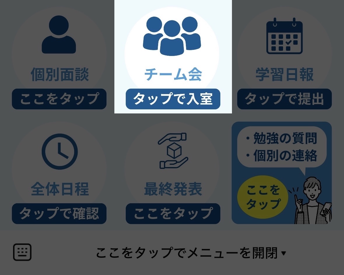 Step1の日程候補を提出し終えたら、公式LINE「カチコーチ」下部メニューから入室方法を確認しましょう。